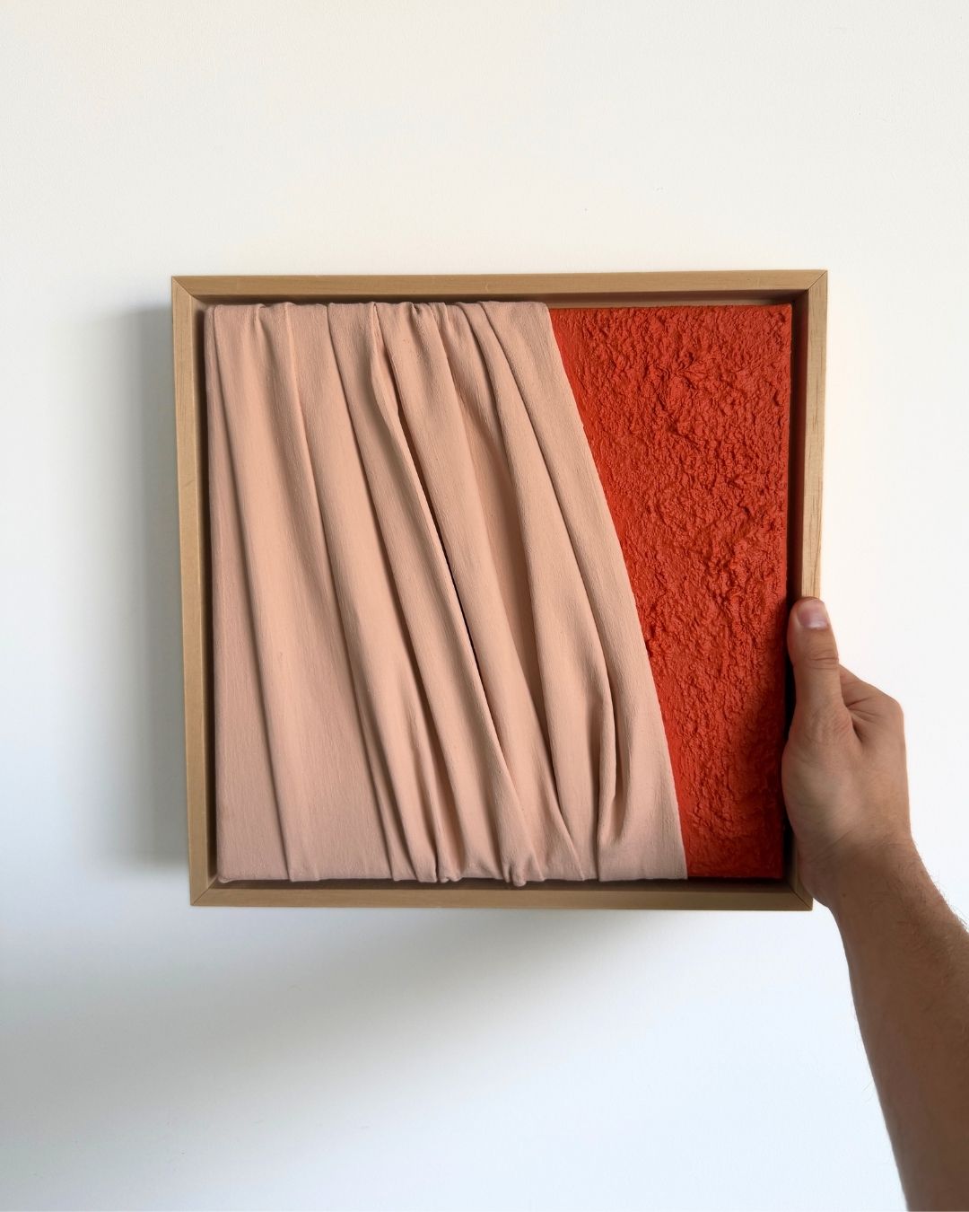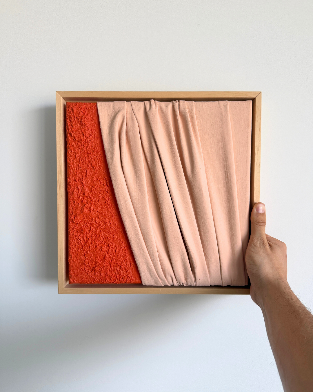 this artwork is inspired by the dahlia, a flower known for its bold, layered petals and broad, slightly serrated leaves. the peach-pink linen folds are inspired by the shape of the dahlia’s leaves, while the bright orange texture reflects the intricate form of the flower’s inner core.